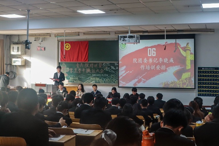 在08201H教室隆重举行2025-2026学年青共校培训开班典礼暨学生骨干换任大会。院党委书记胡向明、院党委副书记兼副院长任雁、院团委书记李晓彧、辅导员祁亚萍出席活动,人妻av