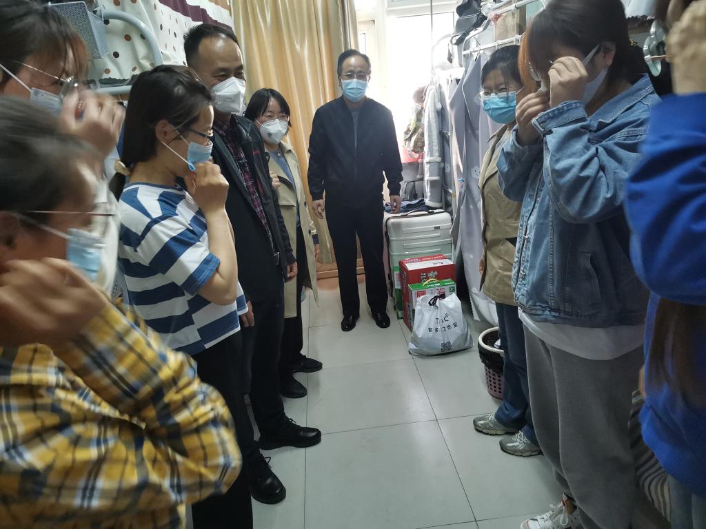 党委书记李运芝、导师常青、学生科科长叶增民、研究生辅导员祁亚萍等一行专程来到她们的新居——文瀛10号楼,看望慰问从16号楼搬离的研究生,为她们送上牛奶、方便面、饼干等慰问品,也带去了全院教师的温暖问候和衷心感谢。李运芝书记每到一个宿舍,都仔细询问同学们的学习、生活、身体健康状况,与同学们分享自己抗疫的经历和感受,对同学们做出“舍小家为大家”的决定表示高度赞扬。同时,李书记也叮嘱班主任和研究生导师要为学生提供有效的服务保障,及时解决实际问题,时刻关注她们的情绪变化,做好心理疏导。导师常青要求同学们做好个人防护,遵守学校疫情防控各项规定,并鼓励研究生们保持积极向上的心态,用勤奋和刻苦为青春增色添彩。